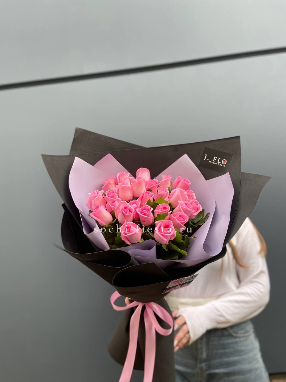 Девятнадцать роз в глубокой черной упаковке создают графичный силуэт с четким ритмом. Темный фон усиливает яркость розовых бутонов и добавляет композиции современное звучание.
