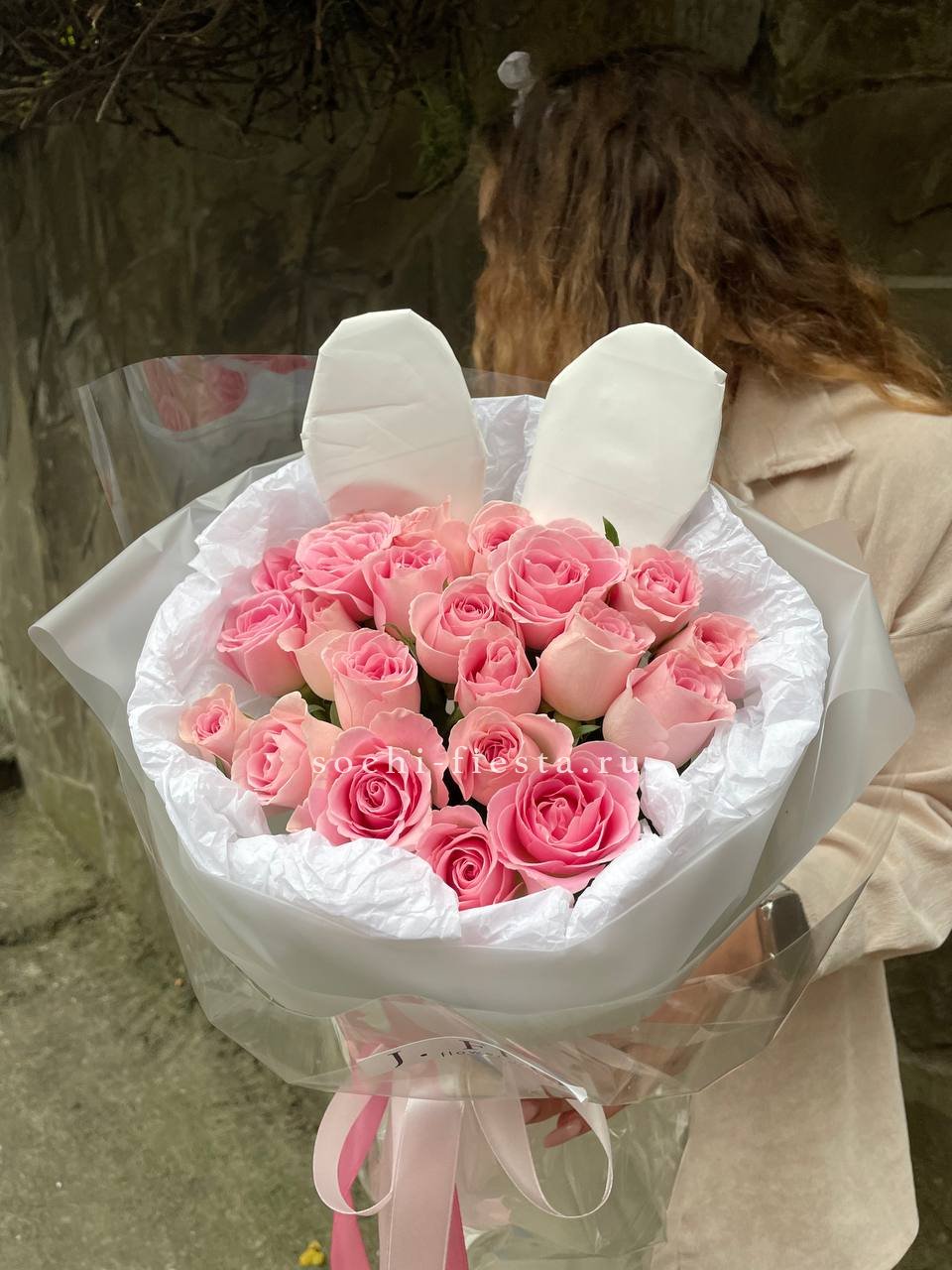 Тридцать одна роза образует пышное облако розового цвета с серебристыми нотами эвкалипта. Крафтовая обертка подчёркивает естественную красоту бутонов и создаёт ощущение лёгкости.