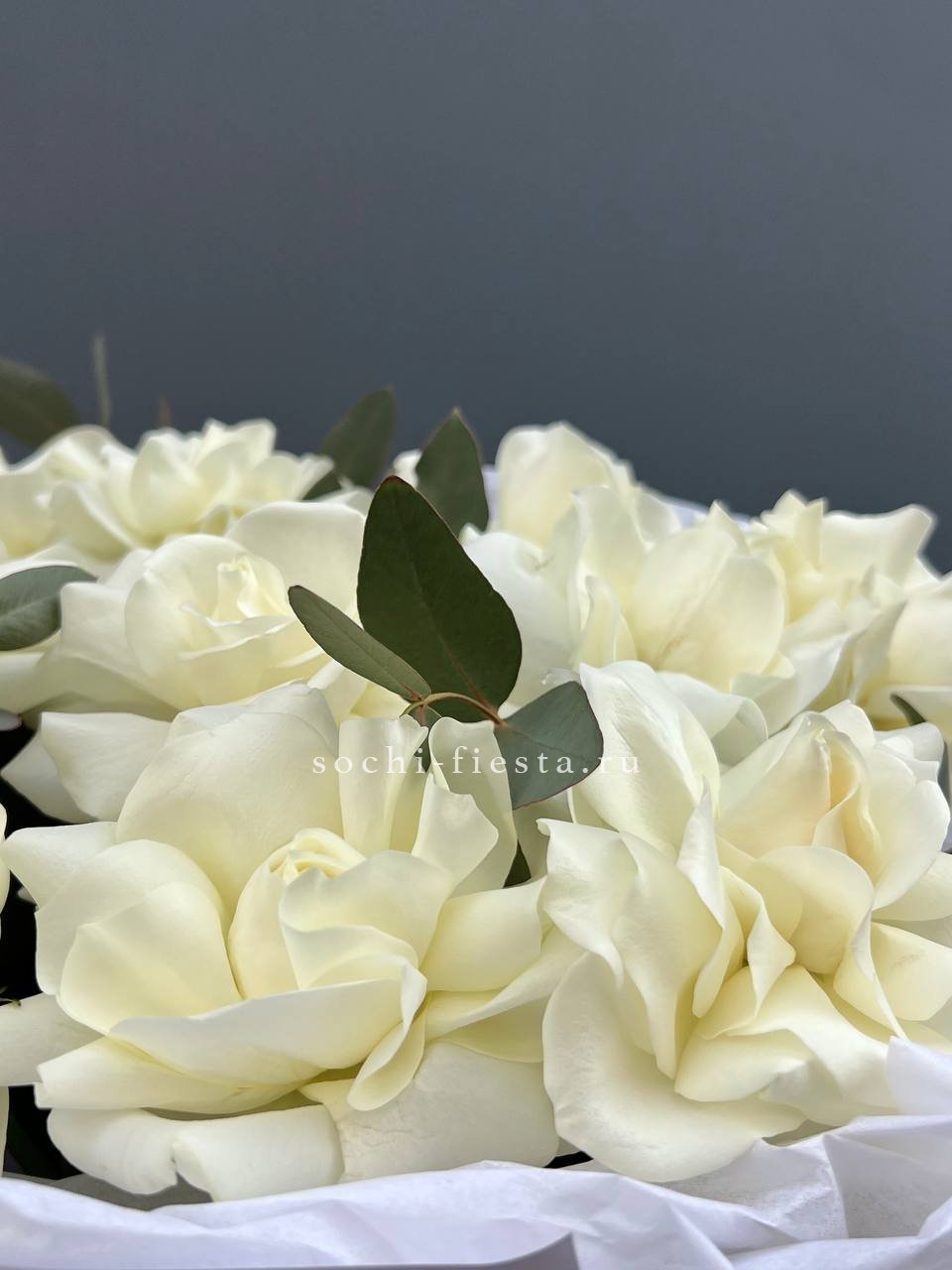 Пять французских роз с вывернутыми лепестками раскрываются широко и создают эффект лёгкой небрежности. Эвкалипт поддерживает форму и добавляет свежести белому цвету.