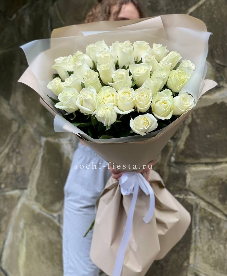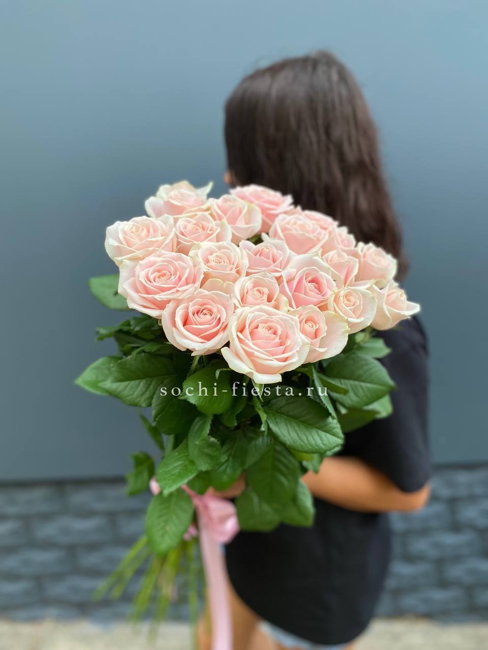 Двадцать пять бутонов выстраиваются в пышную композицию с чётким ритмом и объёмным силуэтом. Голландские розы создают впечатление монументальности и уверенной подачи.