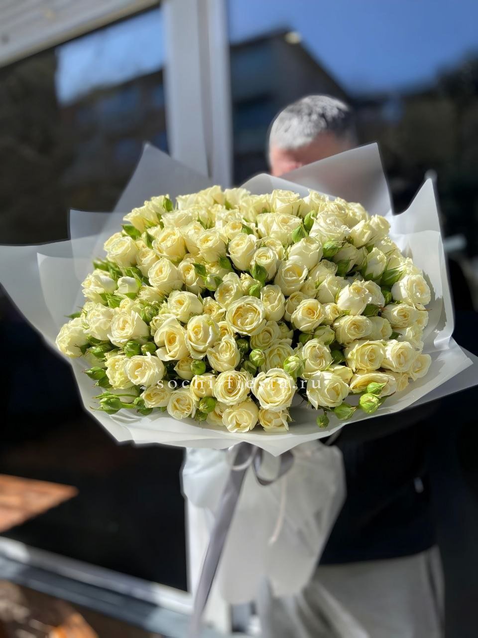 кремовые кустовые розы, лагурус, лента, дизайнерская пленка комбинированная.