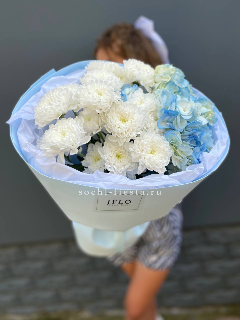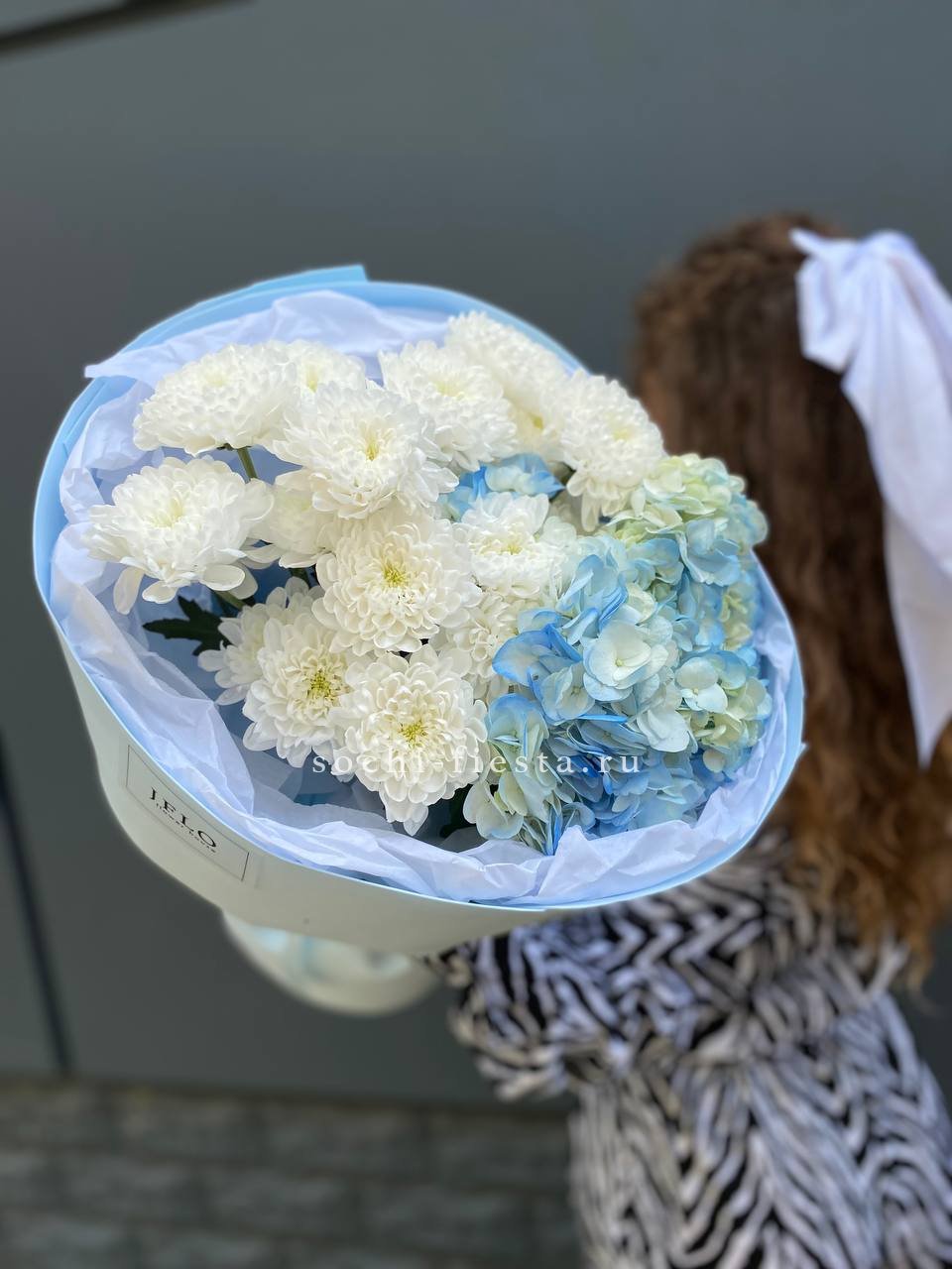 гортензия, розы джумилия, бомбастик, альстромерия, маттиола, чико, авторское оформление.