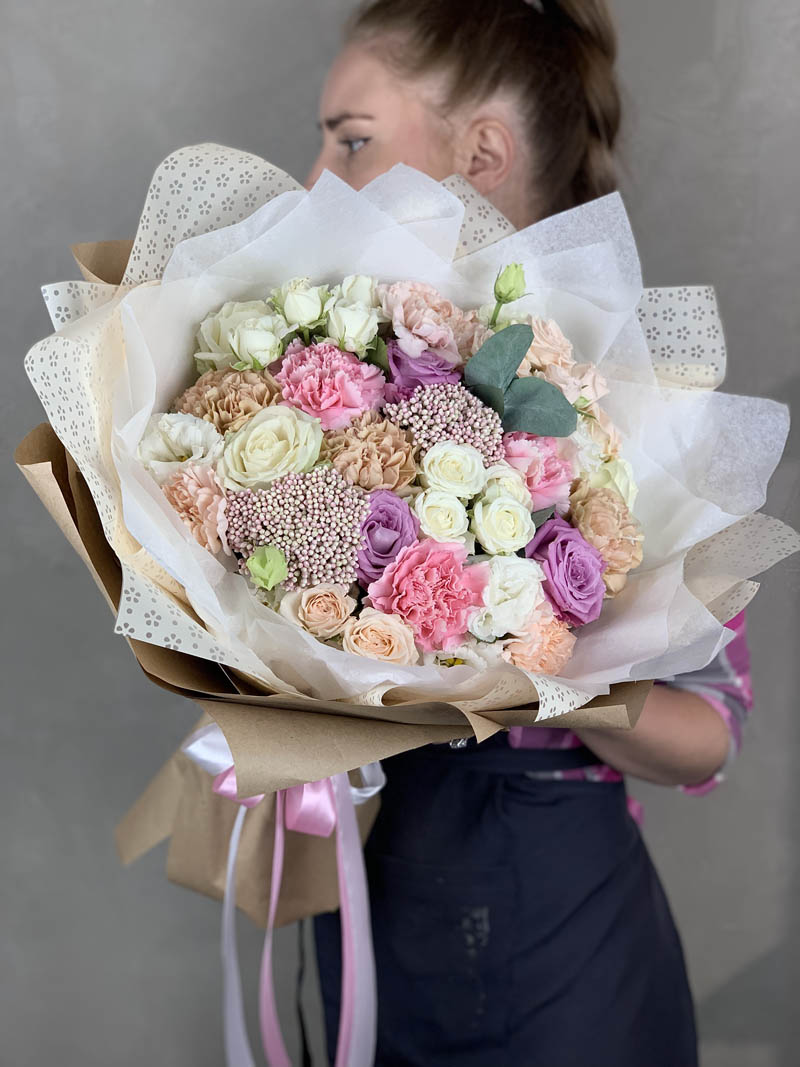 Воздушные диантусы персикового оттенка раскрываются пышными шапками среди нежной эустомы. Ветви эвкалипта придают букету свежесть и легкую графичность.