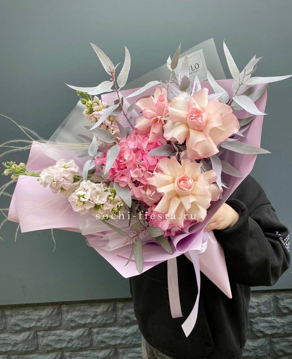 французские розы, маттиола, гортензии, эвкалипт, стифа, упаковка, лента.
