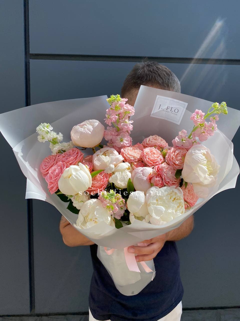 Пионы и пионовидные розы с их многослойными лепестками создают визуальную глубину, а маттиола добавляет вертикальные линии. Букет впечатляет плотностью и объемом раскрывшихся бутонов.
