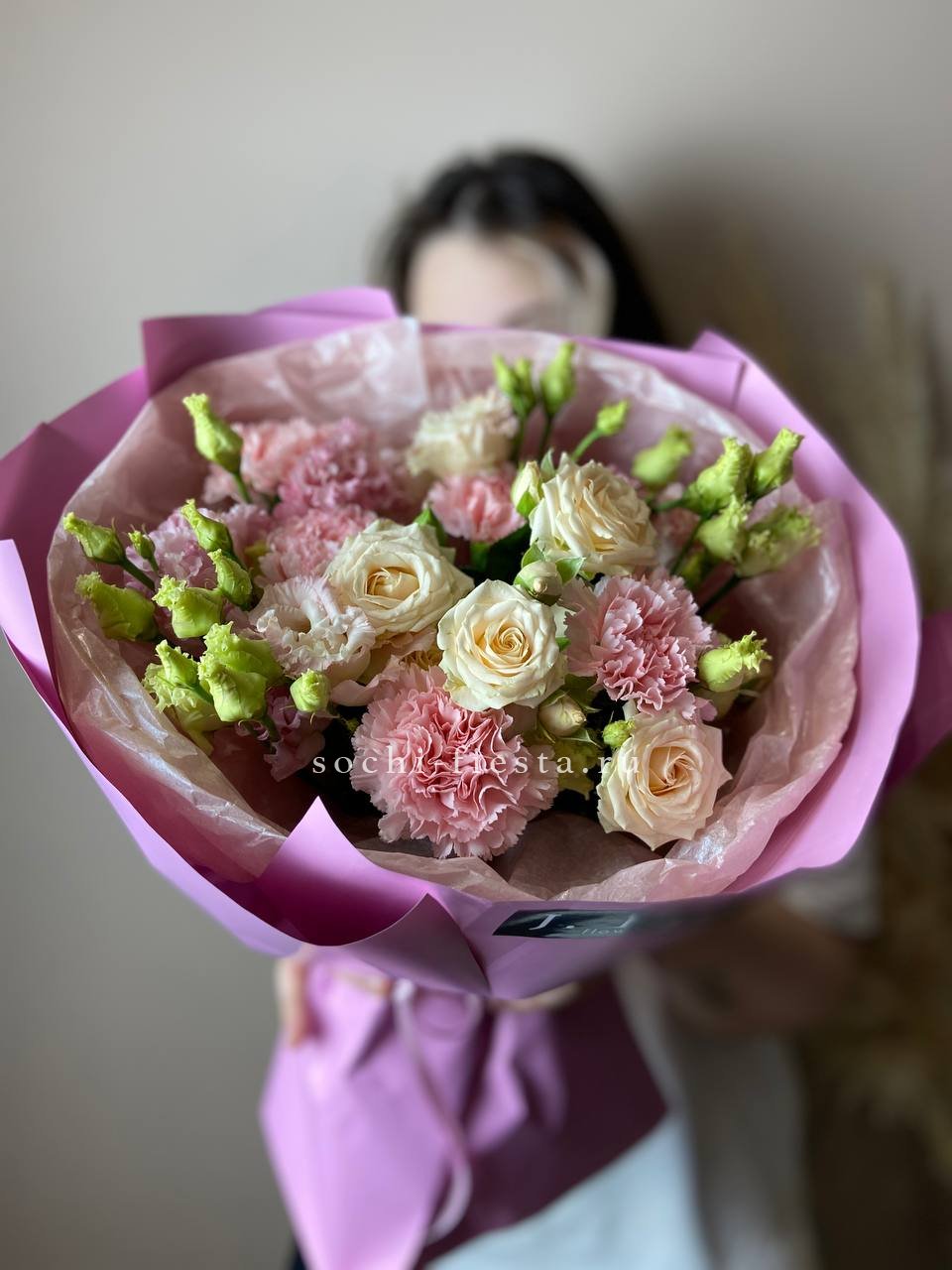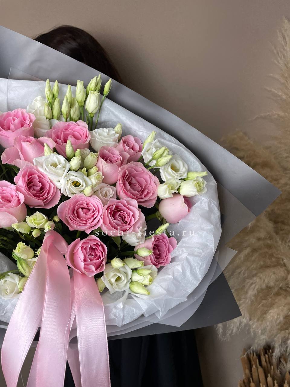 диантусы, эустома, лента, упаковка.