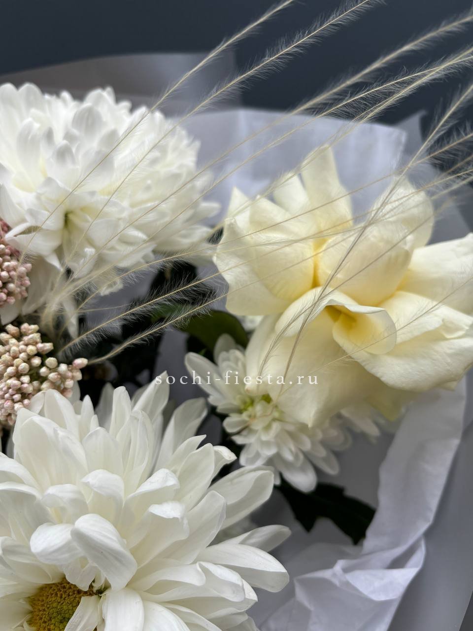 Гортензия задаёт пышную основу, а маттиола и лимониум наполняют букет текстурной глубиной. Французские розы и ковыль создают динамику, которая оживляет композицию и придаёт ей выразительность.
