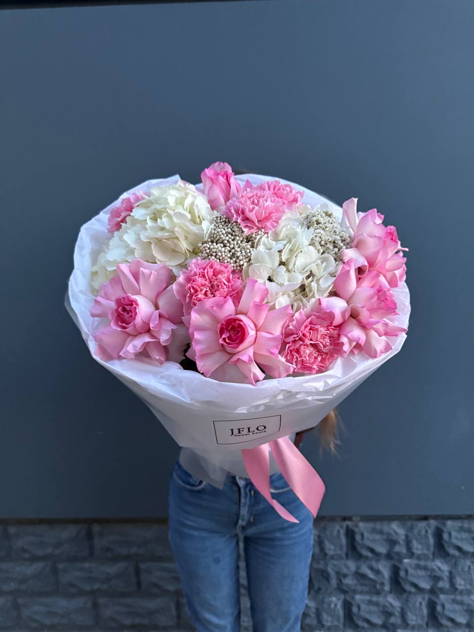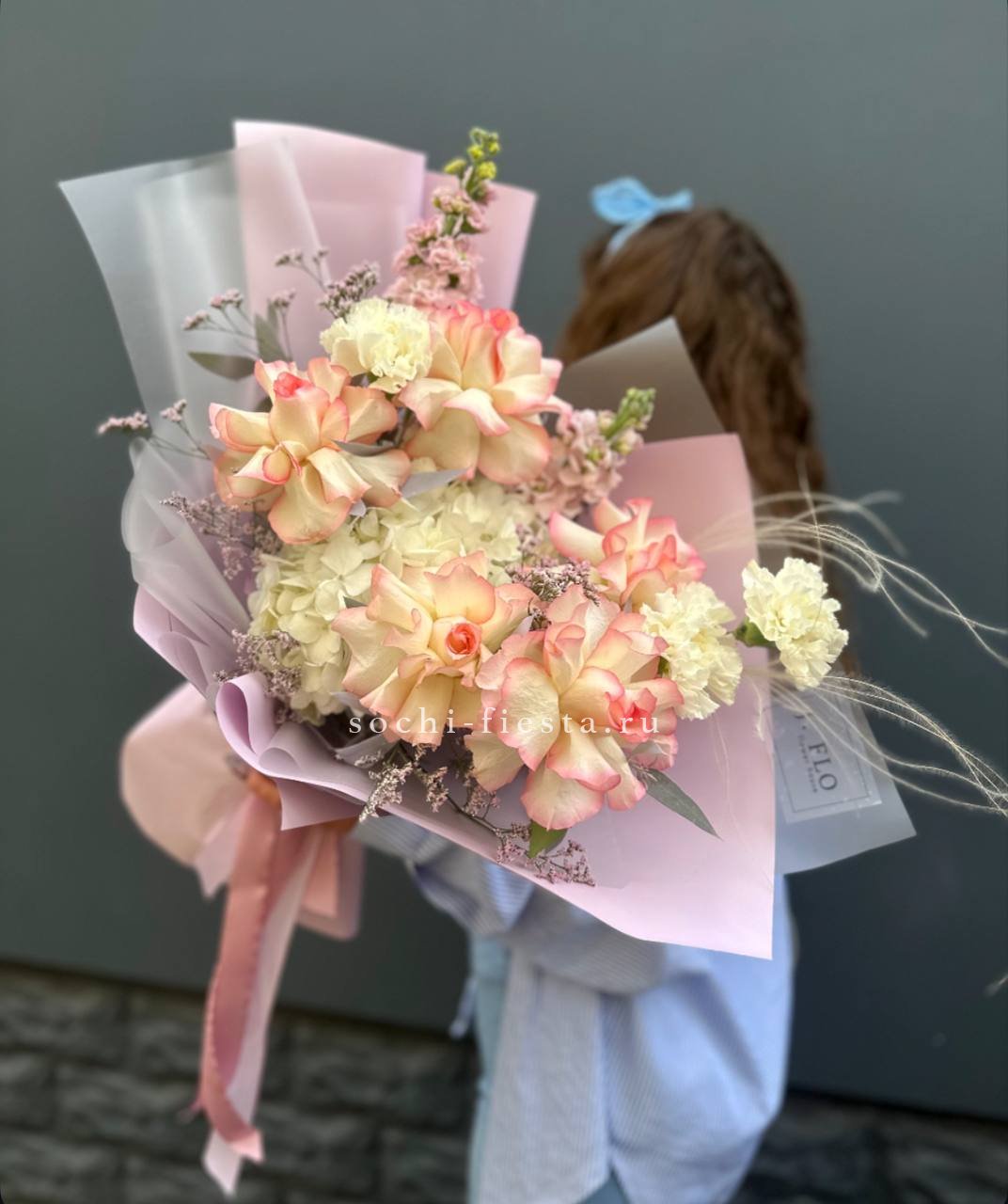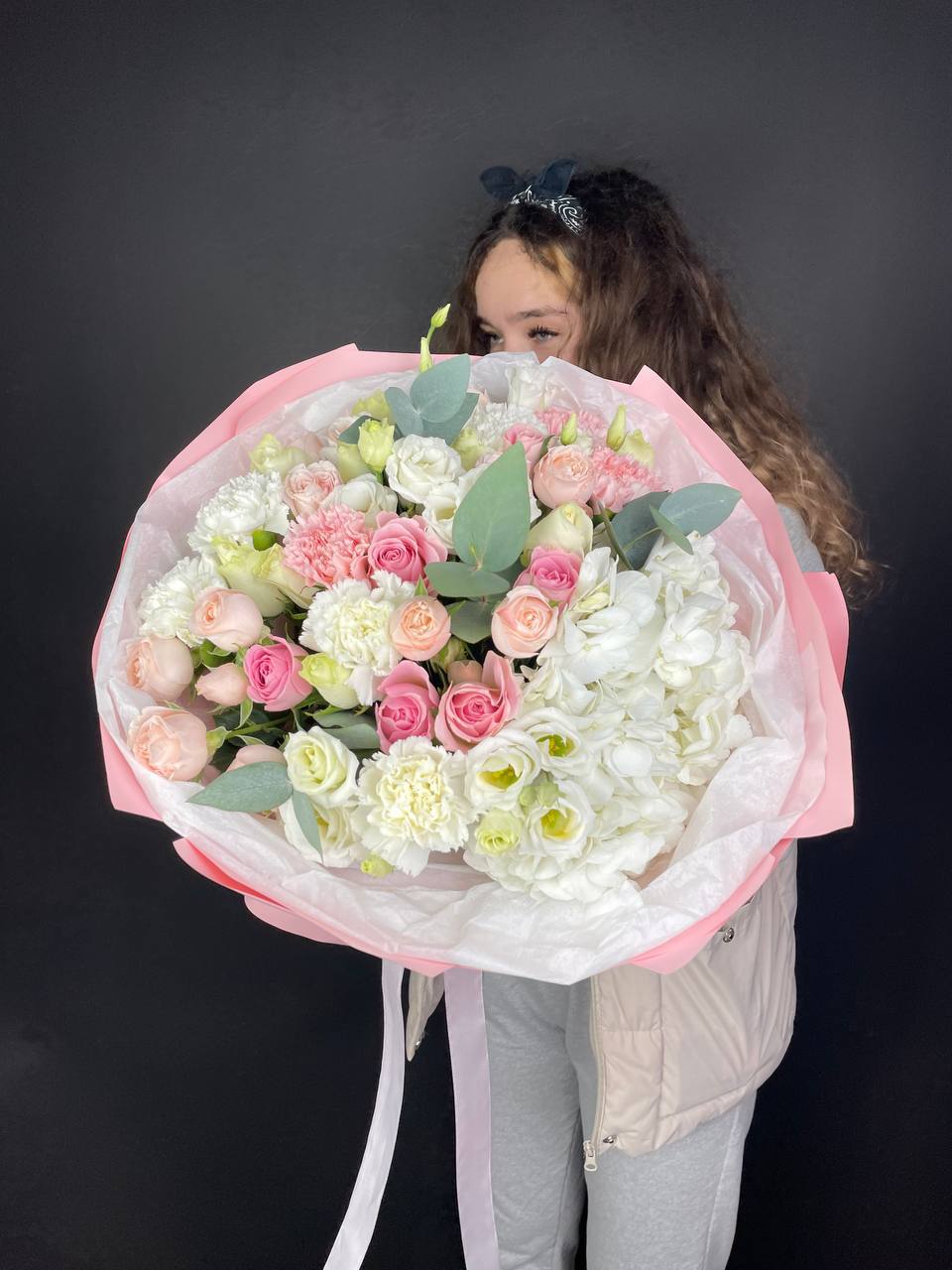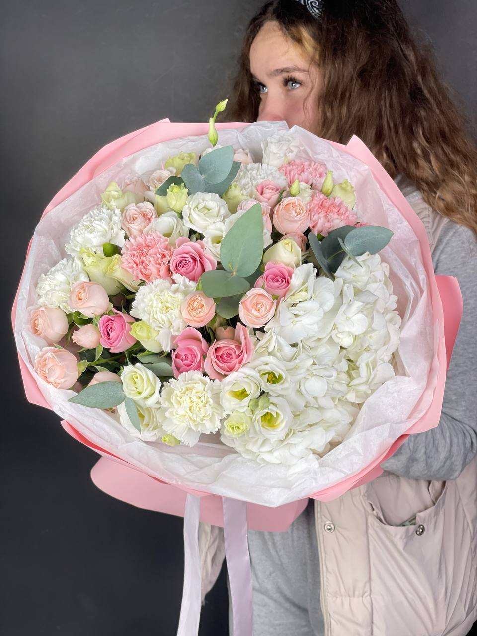 гортензия, французские розы, маттиола, лимониум, дианстусы, эвкалипт, ковыль и дизайнерская упаковка.