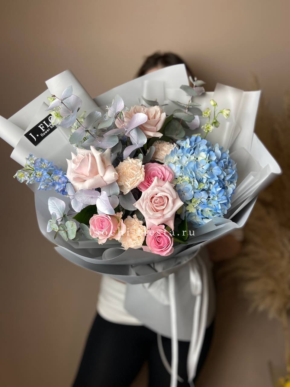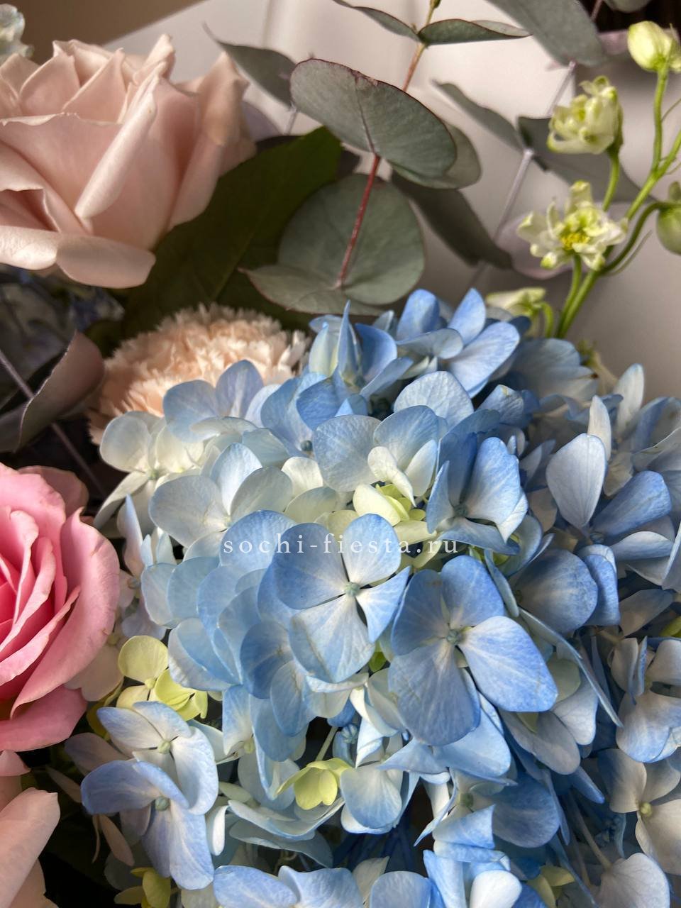 гортензия, роза, кустовая роза, диантус, эустома, дельфиниум, эвкалипт, лента, авторская упаковка.