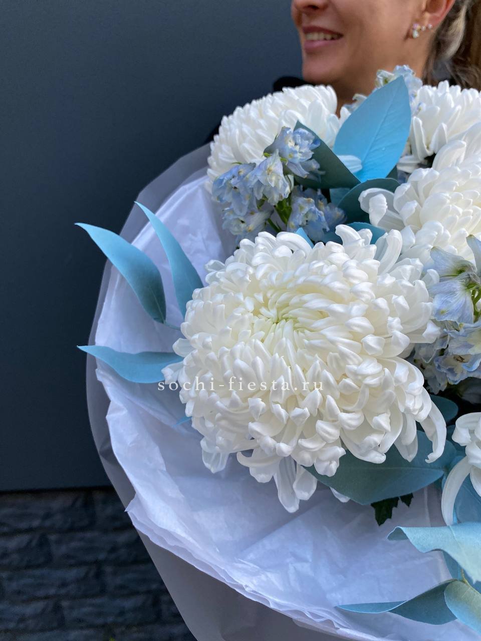 хризантема Бигуди, эвкалипт, дельфиниум, лента, дизайнерская упаковка.