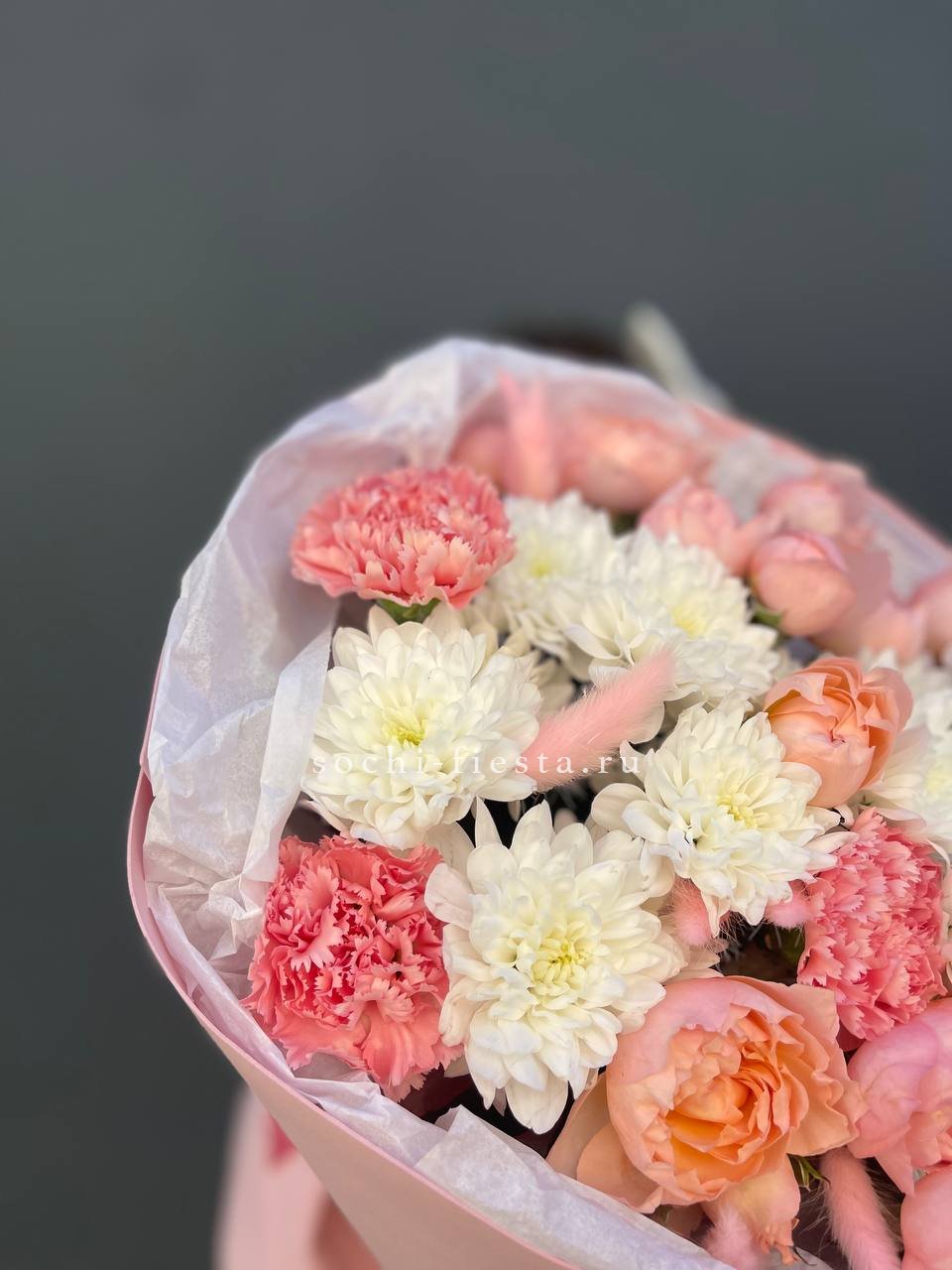 кустовые розы, хризантемы, диантусы, лагурус, лента и дизайнерская пленка.