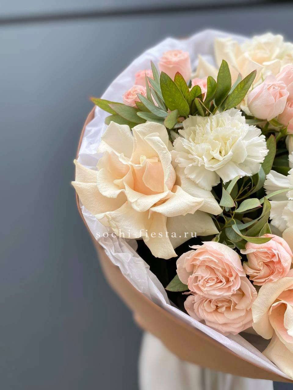 Кремовые и кустовые розы образуют спокойную цветовую гамму с тёплым подтоном. Диантусы добавляют объём, а эвкалипт вносит свежие нотки в общую картину.