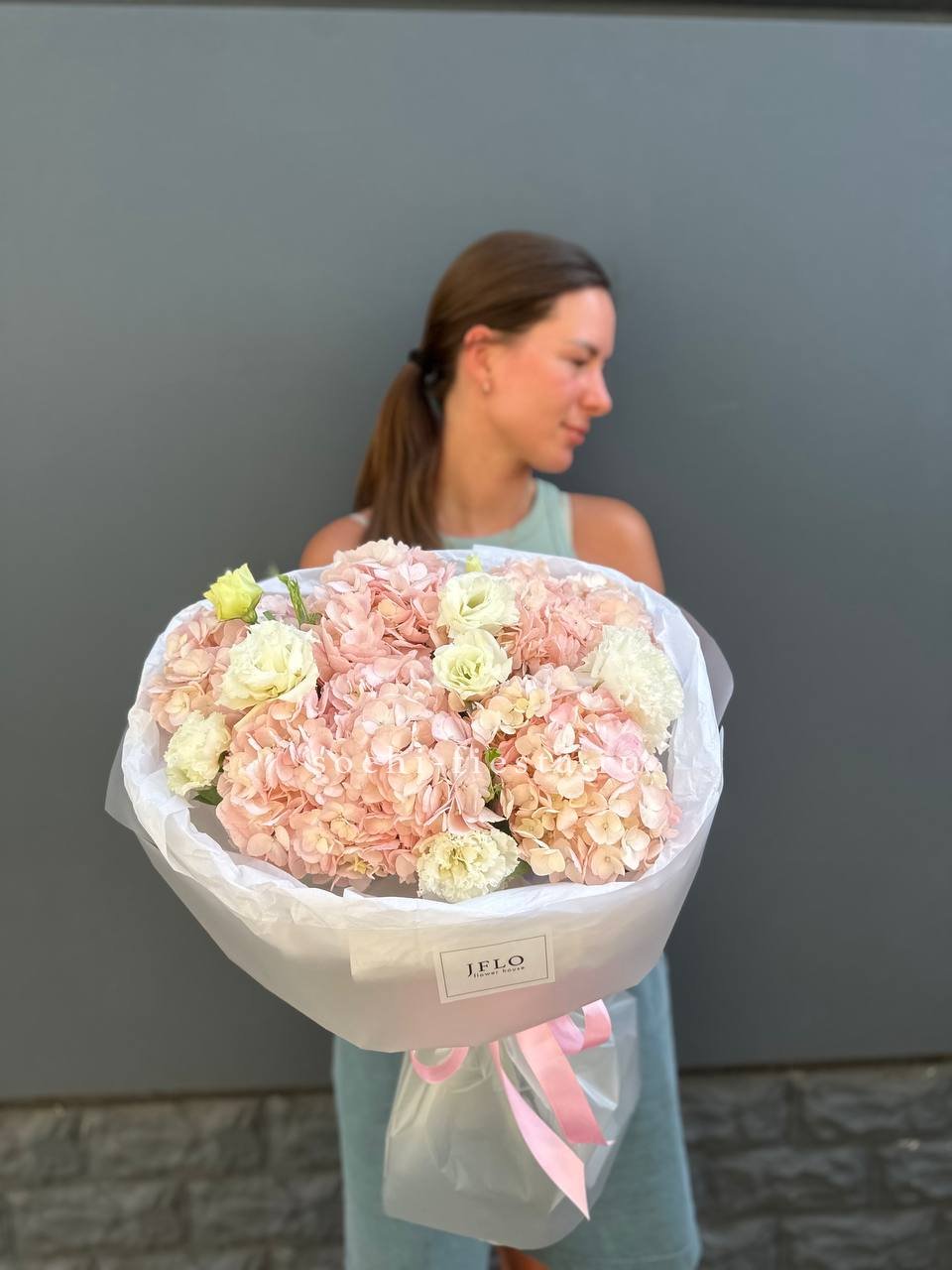 гортензия, роза одноголовая, бомбастик, декоративная зелень, эвкалипт, лента, дизайнерская упаковка.
