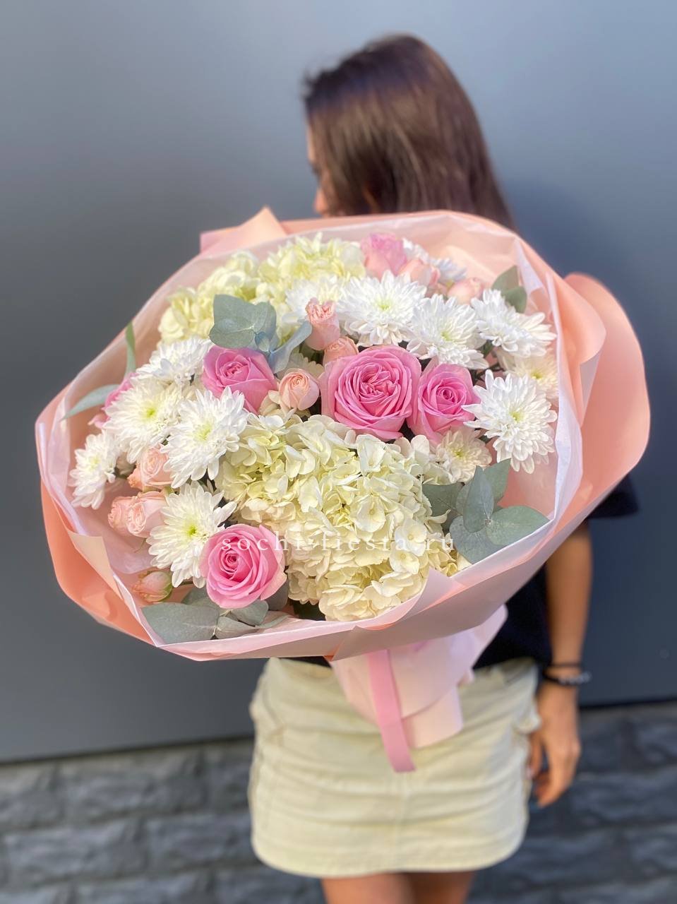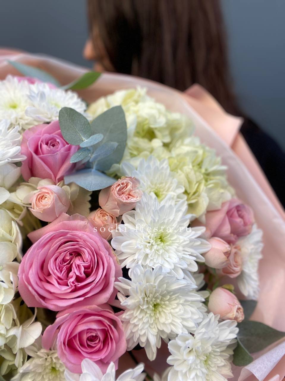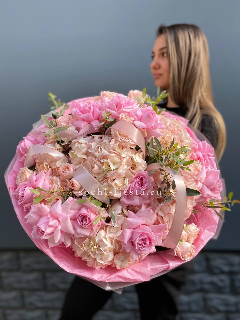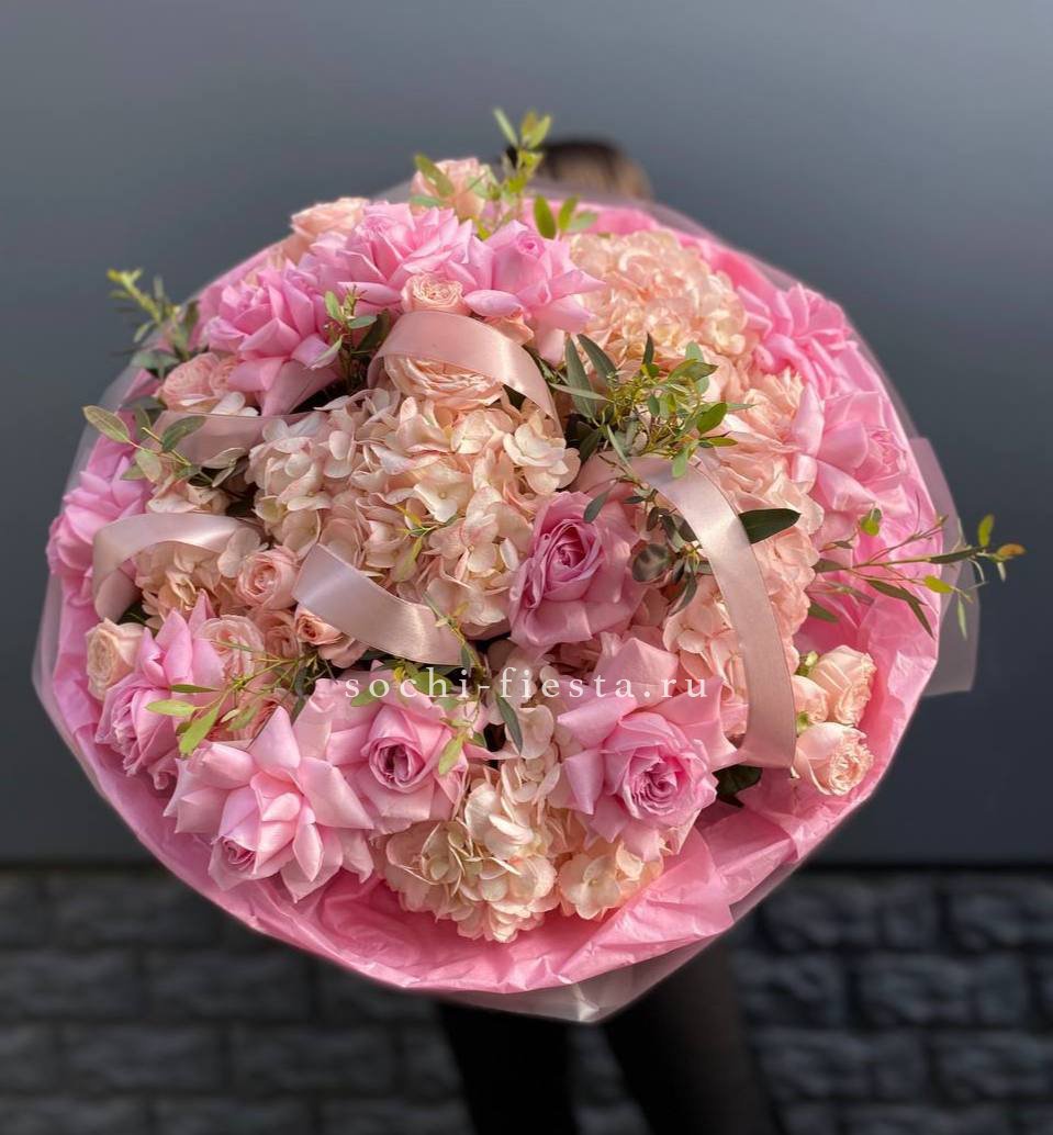гортензия, диантус, кустовая пионовидная роза, эустома, вспомогательные цветы, эвкалипт, лента, дизайнерская упаковка.