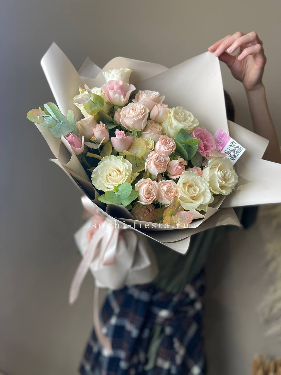 Пионовидные розы и гортензия образуют плотное ядро композиции, а диантус с эустомой разворачиваются по краям. Эвкалипт задает движение и глубину всей формы.