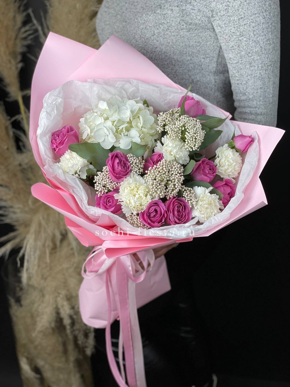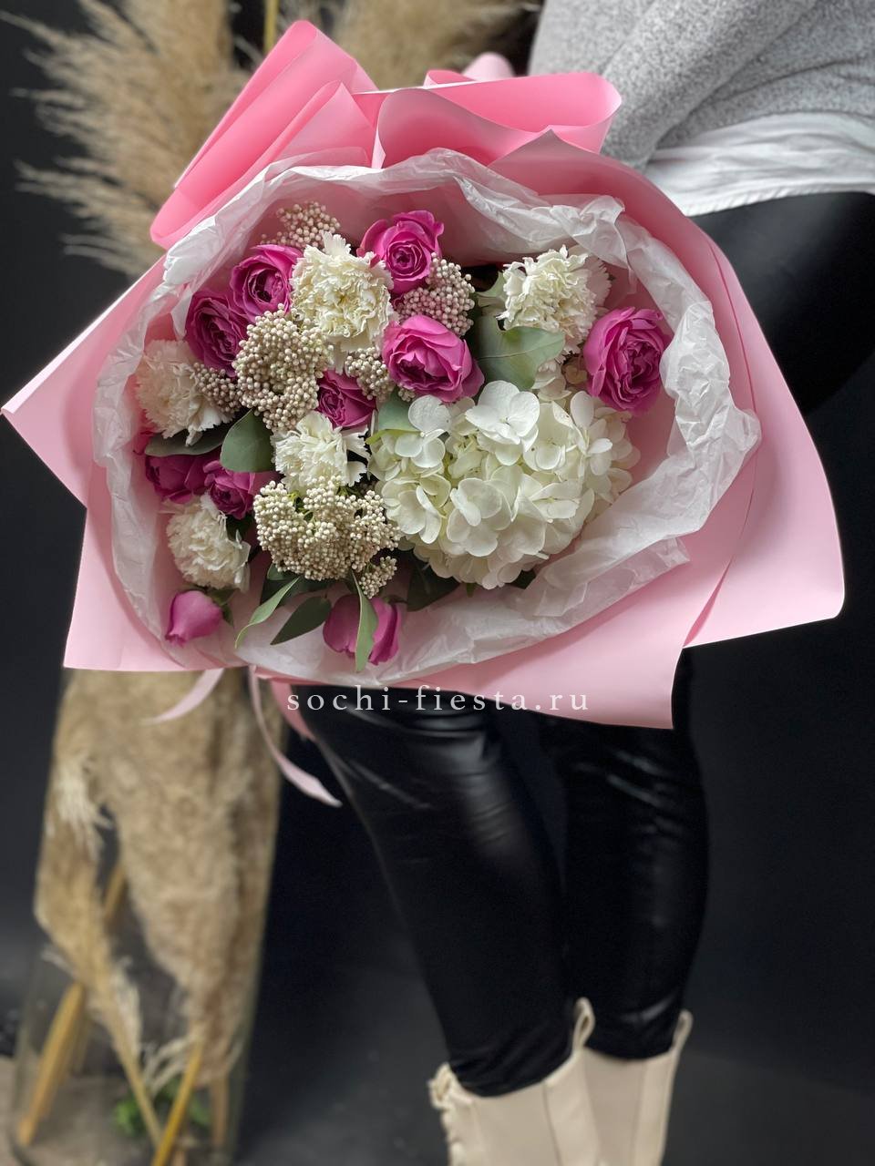 Пышная шапка из гортензии и пионовидных роз собрана с филигранной точностью. Диантус и эустома создают воздушные переходы между крупными соцветиями, а озотамнус добавляет графичные вертикали. Букет для тех, кто понимает язык авторской флористики.