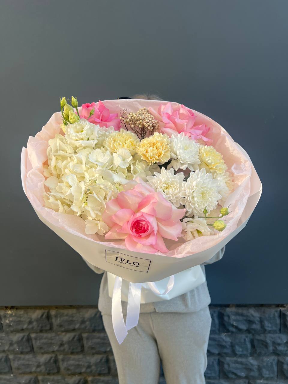 гортензия, гвоздика, статица (или аналог), роза, эустома, дизайнерская пленка, лента.