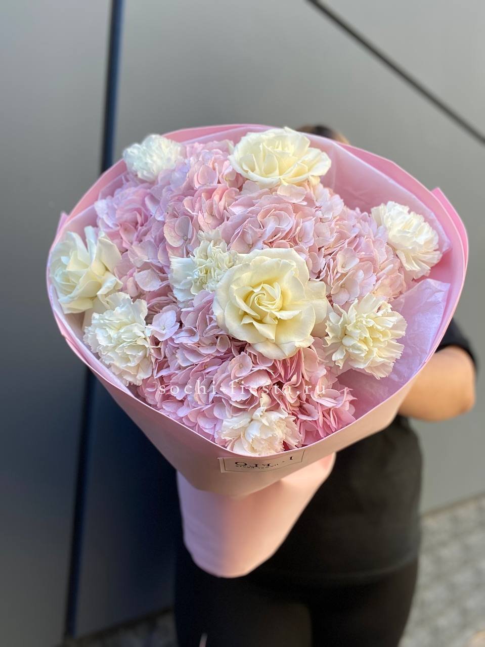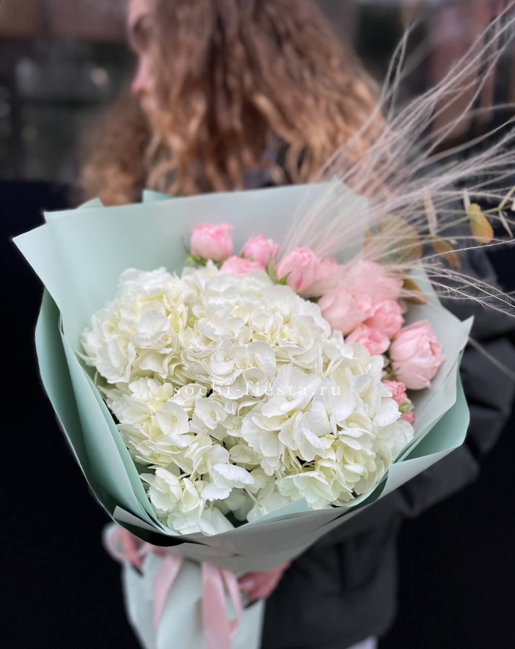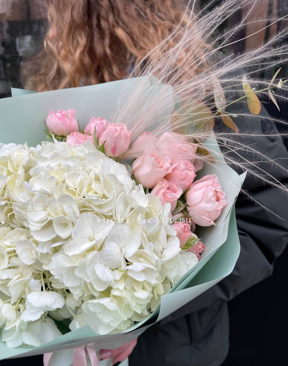 Воздушная композиция с белоснежной гортензией и пионовидными розами в окружении эвкалипта и пампасной травы. Светлая палитра и природная текстура создают ощущение летнего сада. Гармония форм и естественная свежесть в каждом элементе.