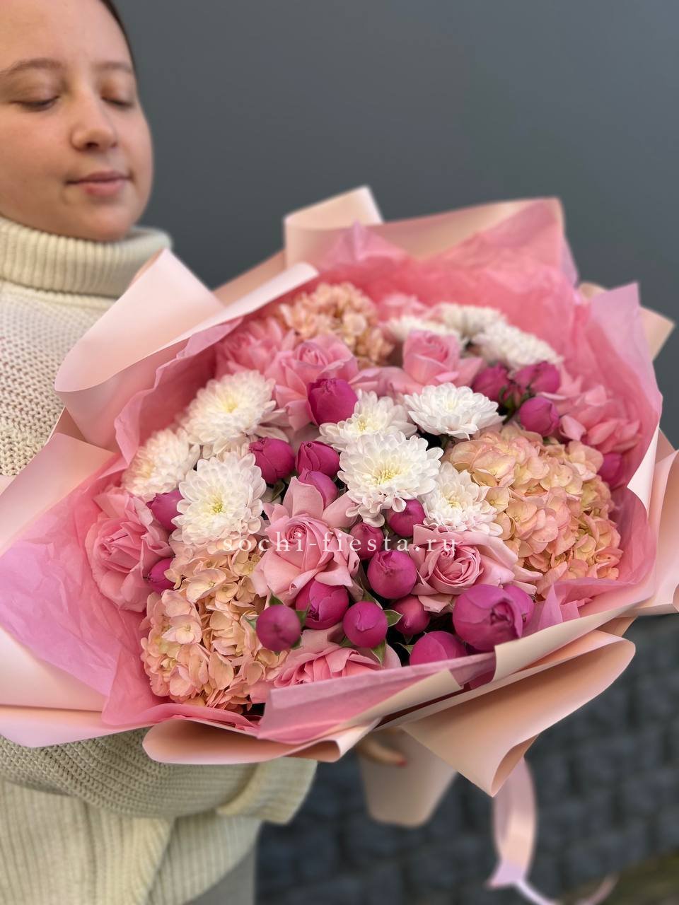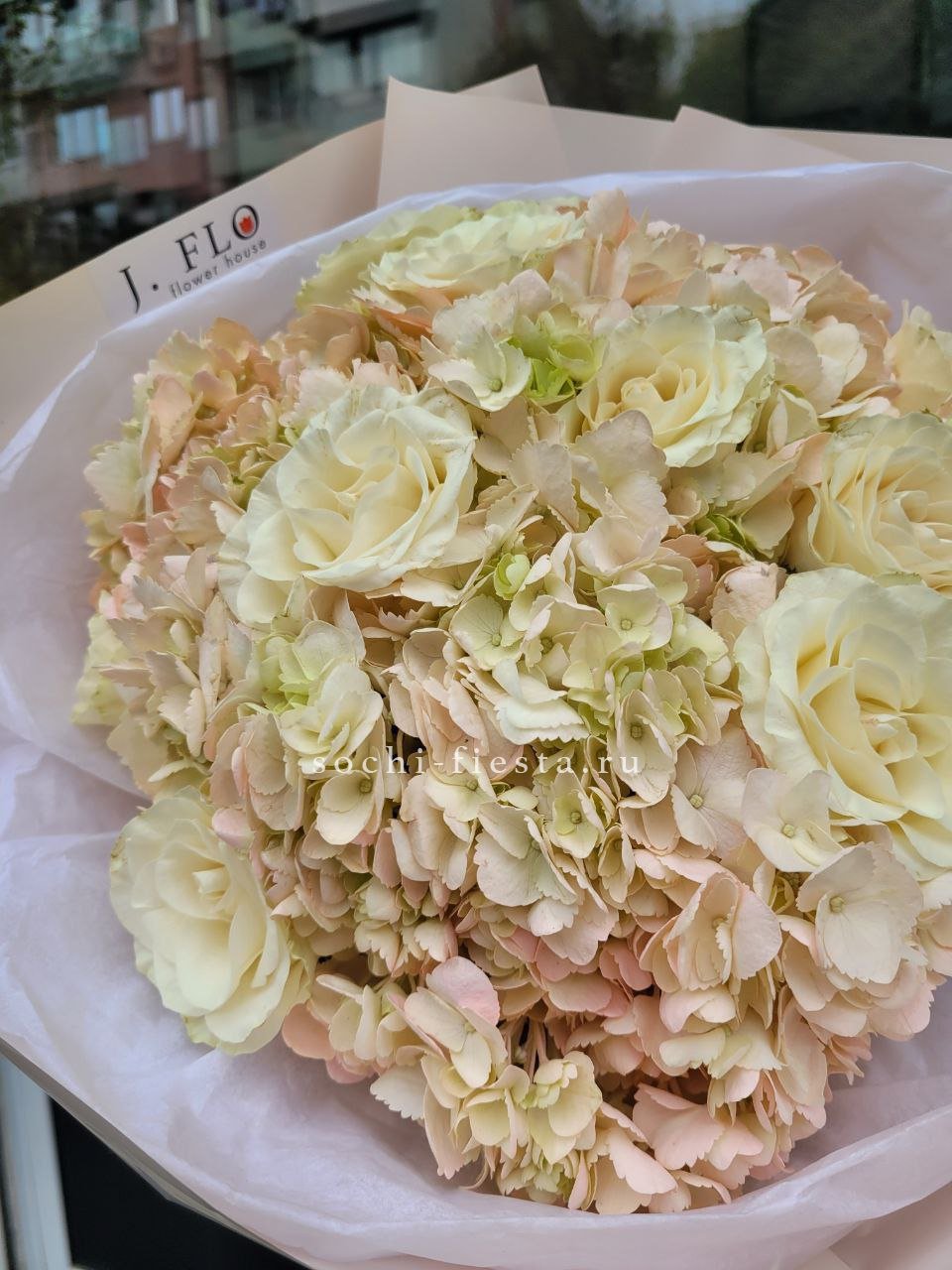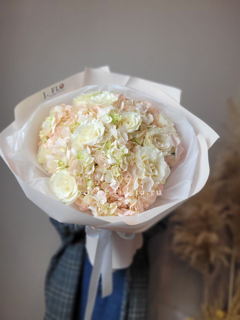 гортензия, пионовидная кустовая роза Мисти Баблс, лента, дизайнерская упаковка.