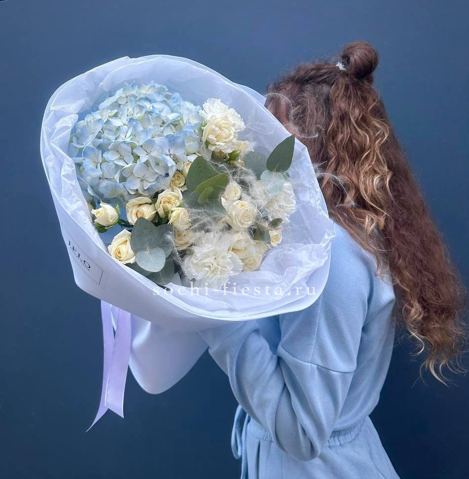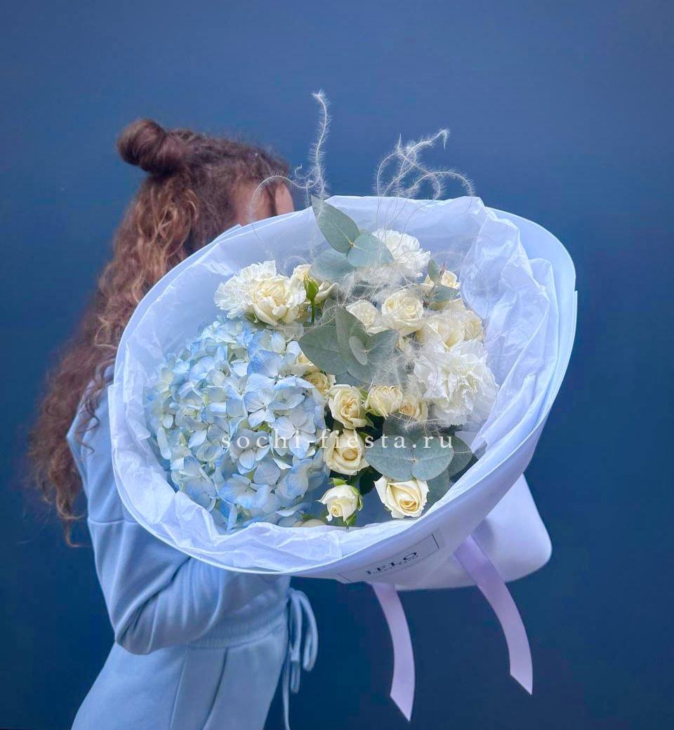 Пышная шапка из роз двух оттенков с объёмной гортензией и воздушным диантусом создаёт мягкий переход от белого к розовому. Бомбастик добавляет букету плотности, а эвкалипт освежает общую композицию. Универсальное решение для яркого поздравления.