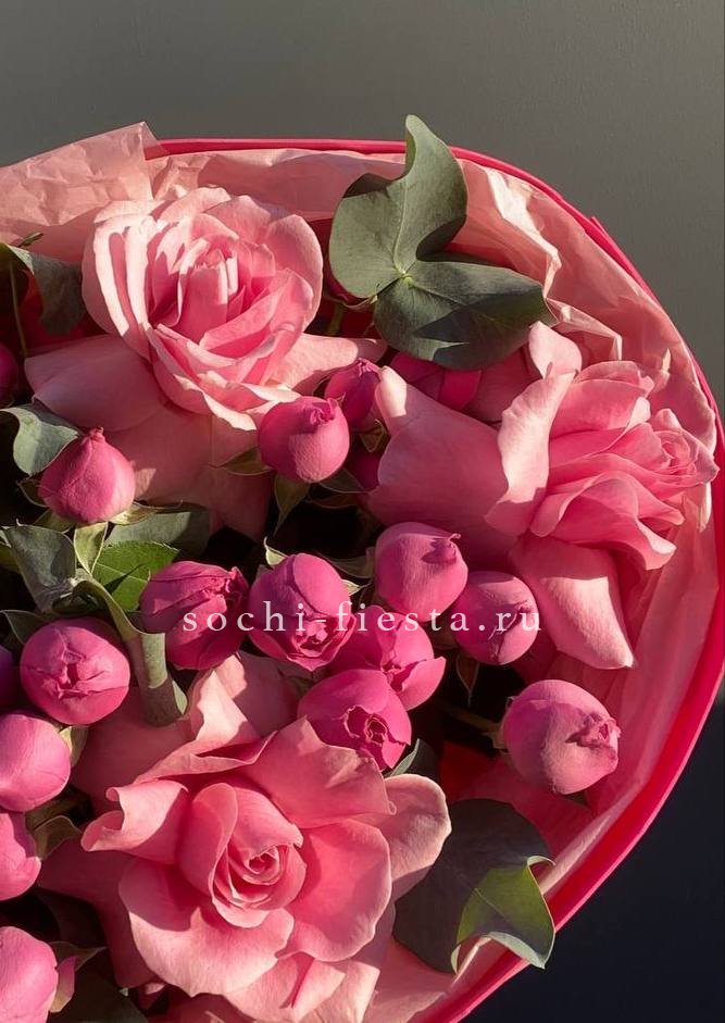 розовые розы, белые розы, диантус, бомбастик, гортензия, эвкалипт, пленка.
