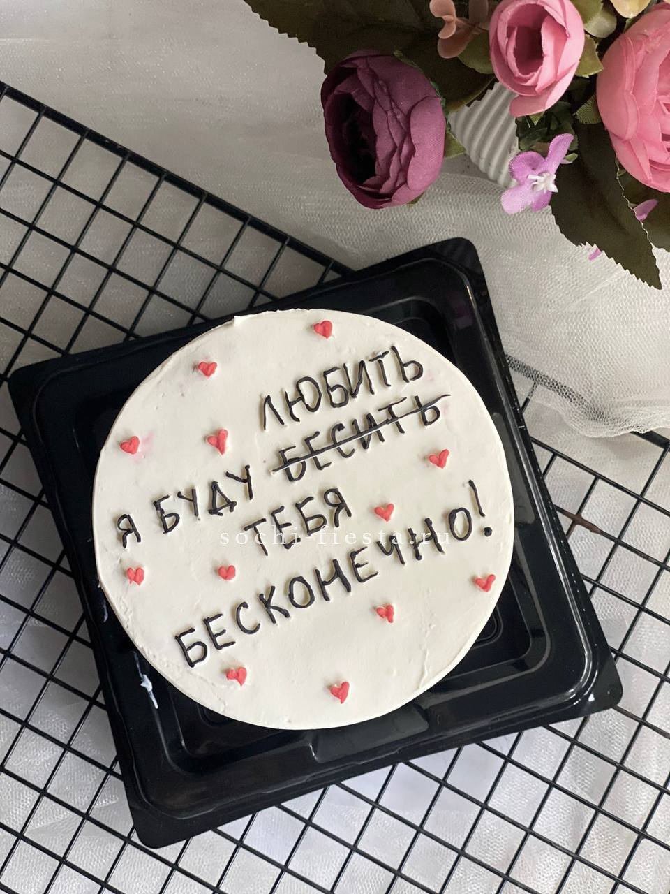 Авторский бенто-торт с романтичным посланием и яркой розово-красной палитрой. Крем формирует мягкие волны и объёмные детали декора. Компактный формат для личного момента.
